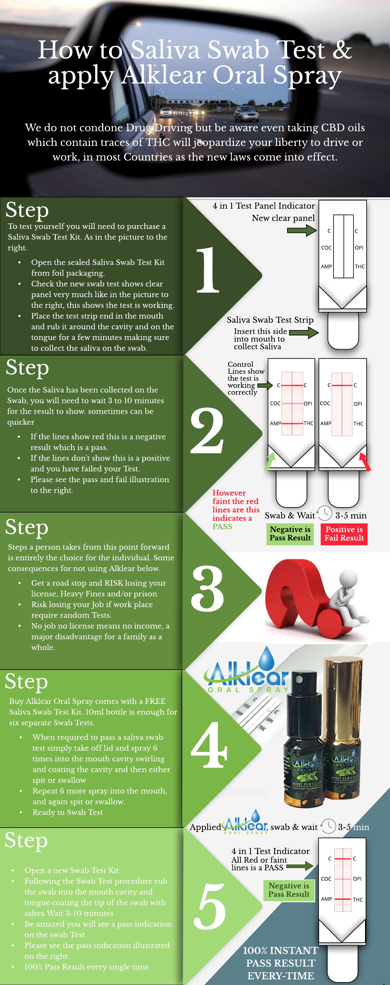Alklear Oral Spray eliminates all drug metabolites from saliva when applied, giving you that instant result on demand designed for responsible persons using prescription drugs not to be wrongfully accused of Drug Driving or whatever the reason maybe. We do not recommend that this is used for any other purpose other than to protect your rights. Please follow instructions as described to get the desired result. You will pass every time, we have 100% confidence this delivers results. CBD oil users may find that there could be traces of THC very minute so beware, you don’t fail your Saliva Swab Test.